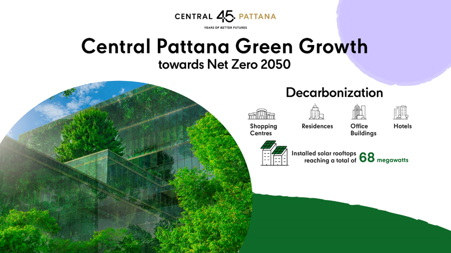 - จัดตั้งบริษัท ‘เซ็นทรัลพัฒนากรีนโกรท’ เพื่อขับเคลื่อนภารกิจ Decarbonization และลดการปล่อยก๊าซเรือนกระจกอย่างเป็นรูปธรรม โดยเริ่มจากแผนงานหลักในการติดตั้ง Solar Rooftop เพิ่มกำลังการผลิตไฟฟ้าสะอาดกว่า 35 เมกะวัตต์ (ทำให้เซ็นทรัลพัฒนามีกำลังการผลิตรวมกว่า 68 เมกะวัตต์ หรือคิดเป็น8% ของการผลิตโซลาร์ทั้งประเทศ) เพื่อสนับสนุนโครงการต่างๆ ของเซ็นทรัลพัฒนา พร้อมทั้งมุ่งแสวงหาเทคโนโลยีด้านพลังงานและสิ่งแวดล้อมใหม่ๆ สำหรับทุกโครงการในอนาคต และต่อยอดศักยภาพสู่การให้บริการแก่บริษัทอื่นทั้งในและนอกกลุ่มเซ็นทรัล