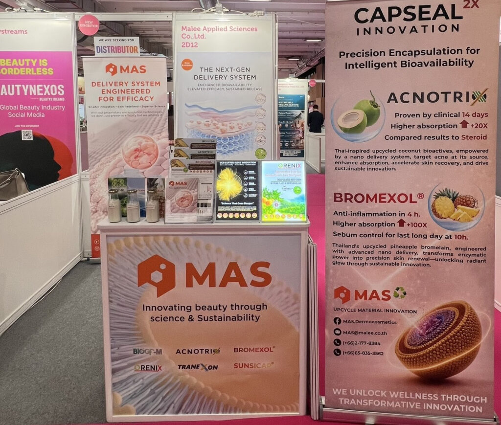 ภายในงาน MAS ได้นำเสนอผลงานนวัตกรรม BROMEXOL® วัตถุดิบนวัตกรรมนำส่งเอนไซม์บรอมิเลน (Bromelain) สารสำคัญจากเปลือกสับปะรด เข้าร่วมประกวดรางวัล “Best Active Ingredient Awards 2026” ใน Innovation Zone โดยชูจุดเด่นของเทคโนโลยีห่อหุ้ม CAPSEAL2X ที่ผสานแนวคิด Thainess Upcycled Plant Bioactives นำวัตถุดิบเหลือใช้ทางการเกษตรจากเปลือกสับปะรดมาเพิ่มมูลค่าเชิงนวัตกรรมสู่ภาคอุตสาหกรรมความงาม